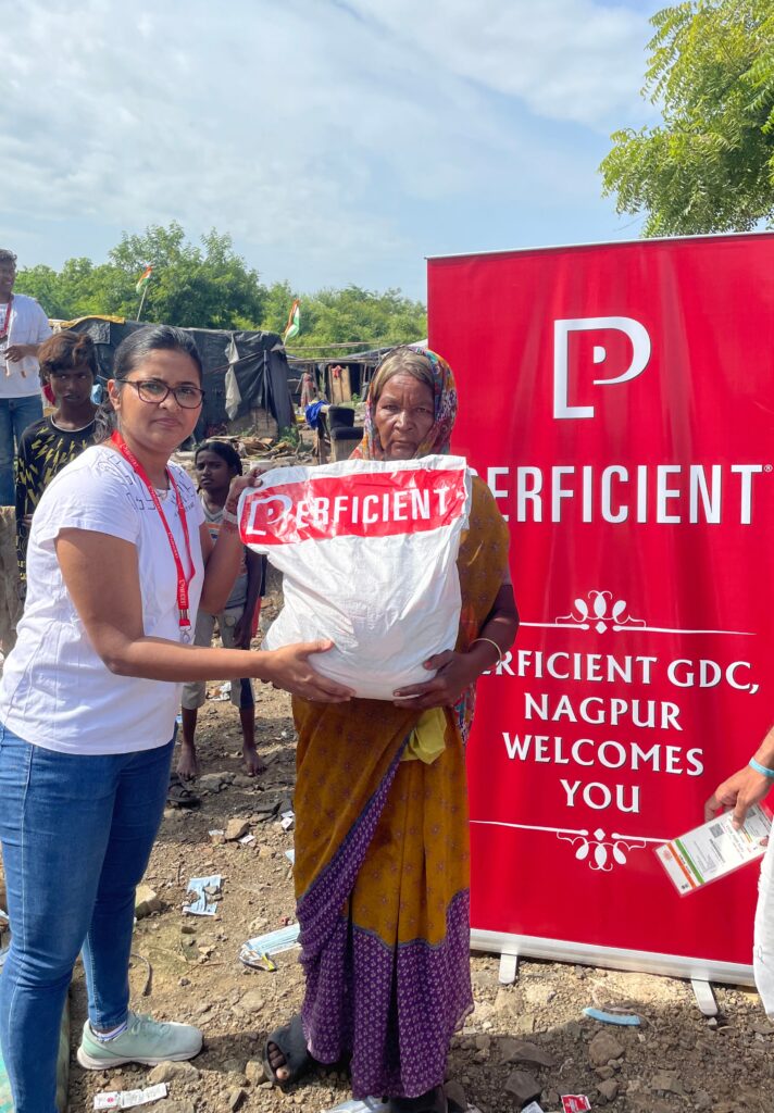 Our colleagues in Nagpur partnered with the Robin Hood Army, a volunteer-based organization that works to distribute food items to those in need, to package and deliver bags containing essential grocery items to underprivileged families. Thanks to the generosity of our Nagpur colleagues, 70 families each received a 33-pound bag of groceries – approximately 2,300 pounds of food in total!