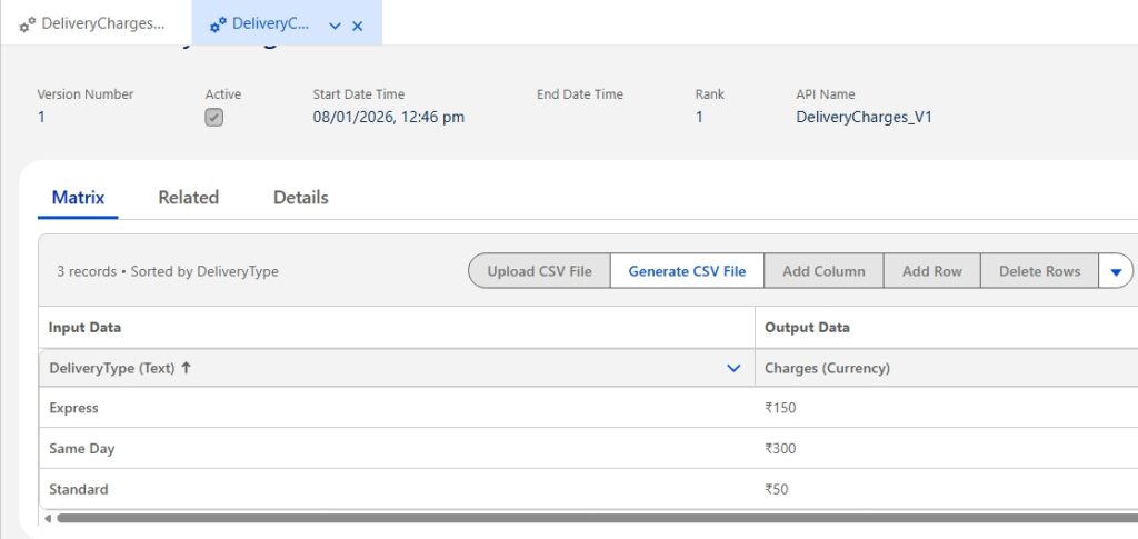 - Associate it with an existing Decision Matrix, such as DeliveryCharges